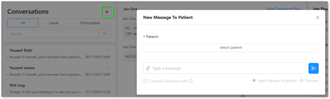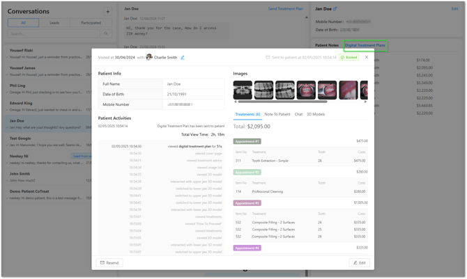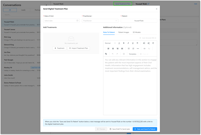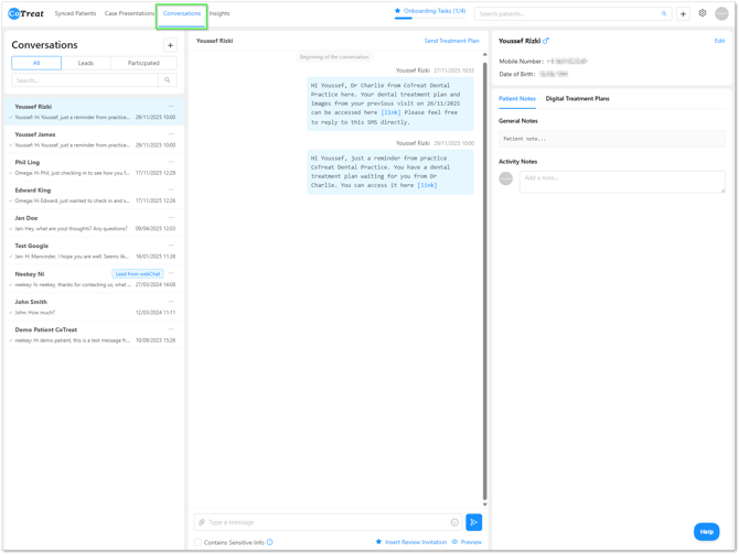 The Conversations feature lets you send and receive messages with patients in one place. You can use it to follow up on treatment plans, answer questions, or send gentle reminders. Messages are sent via SMS and patients can reply directly.
