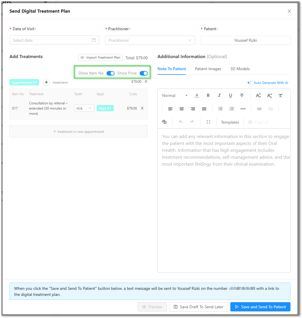 When creating or sending a Digital Treatment Plan, you can easily customise what the patient sees.